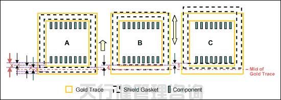 上图中,A代表设计意图:保护垫片正好在金线中间,不接触基带元件。b表示PCB底板相对于保护环的位置偏差。c表示保护垫片位置的波动与情况b一致。在本例中,不考虑歪斜。