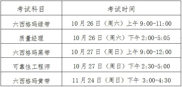 2019年度考试包括:六西格玛黄带、六西格玛绿带、六西格玛黑带、质量经理、可靠性工程师等五项。